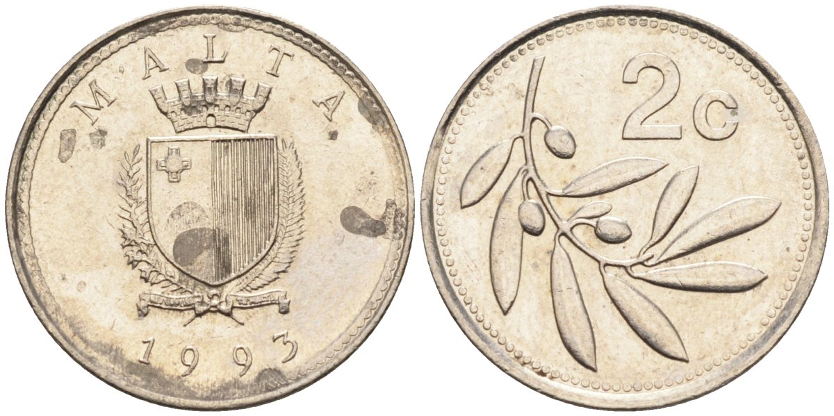 Мальта 2 цента 1993 оливковая ветвь KM 94 медно-никель 112-1052