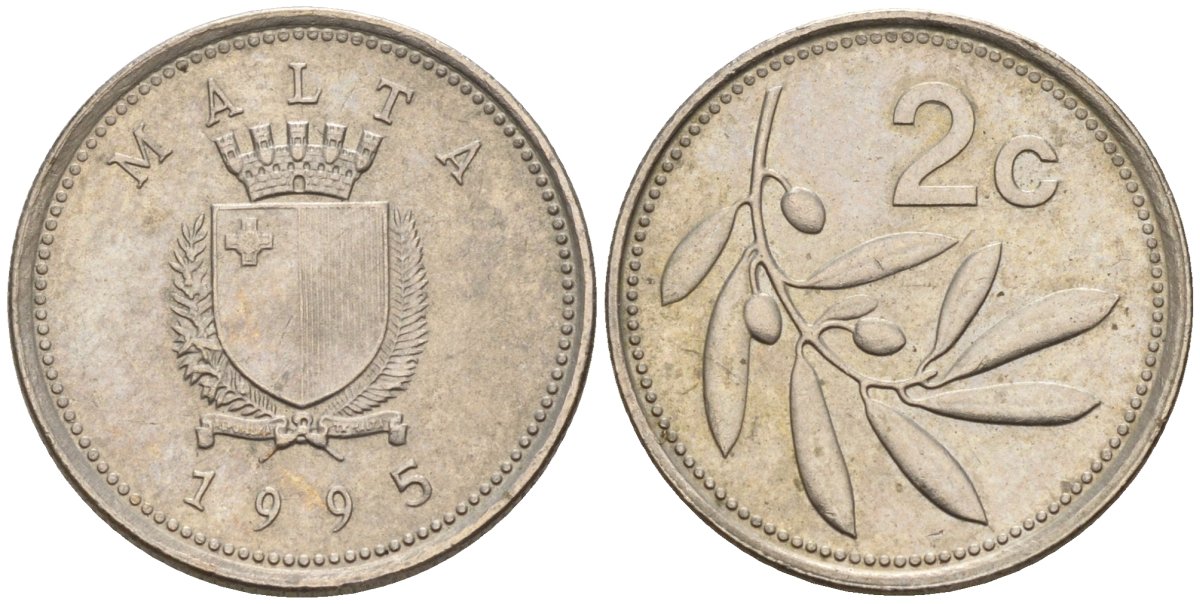 Мальта 2 цента 1995 оливковая ветвь KM 94 медно-никель 4596-818