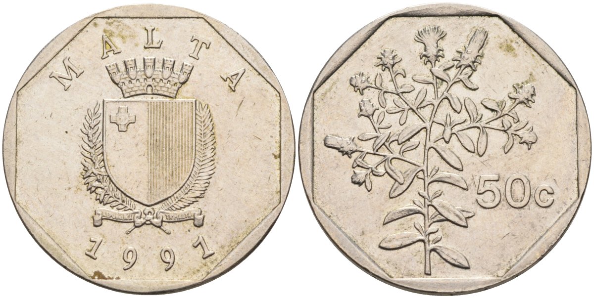 Мальта 50 центов 1991 девясил KM 98 медно-никель 4574-423
