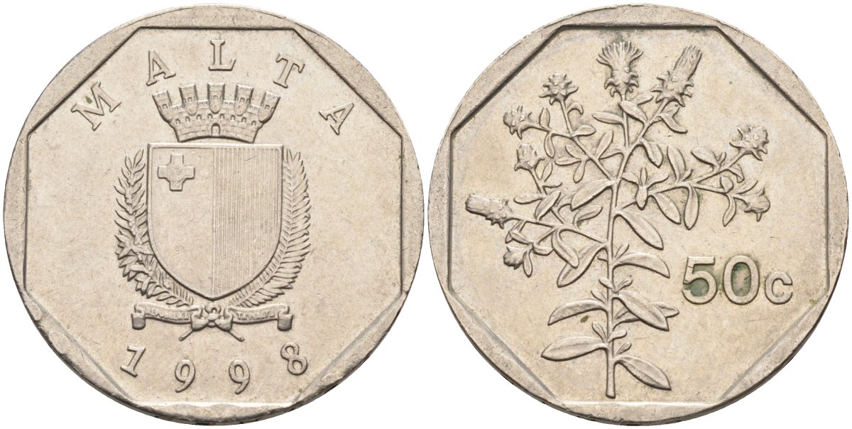 Мальта 50 центов 1998 девясил KM 98 медно-никель 92-645