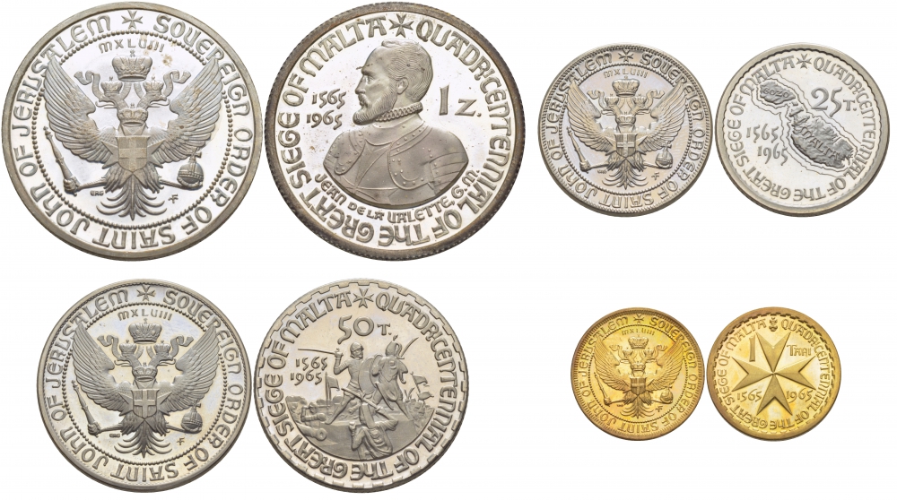 Мальтийский орден Святого Иоанна Иерусалимского набор 1, 25, 50 тари и 1 зехчини 1965 400 лет освобождения от турков KM X40i-04 PROOF 00-810-69