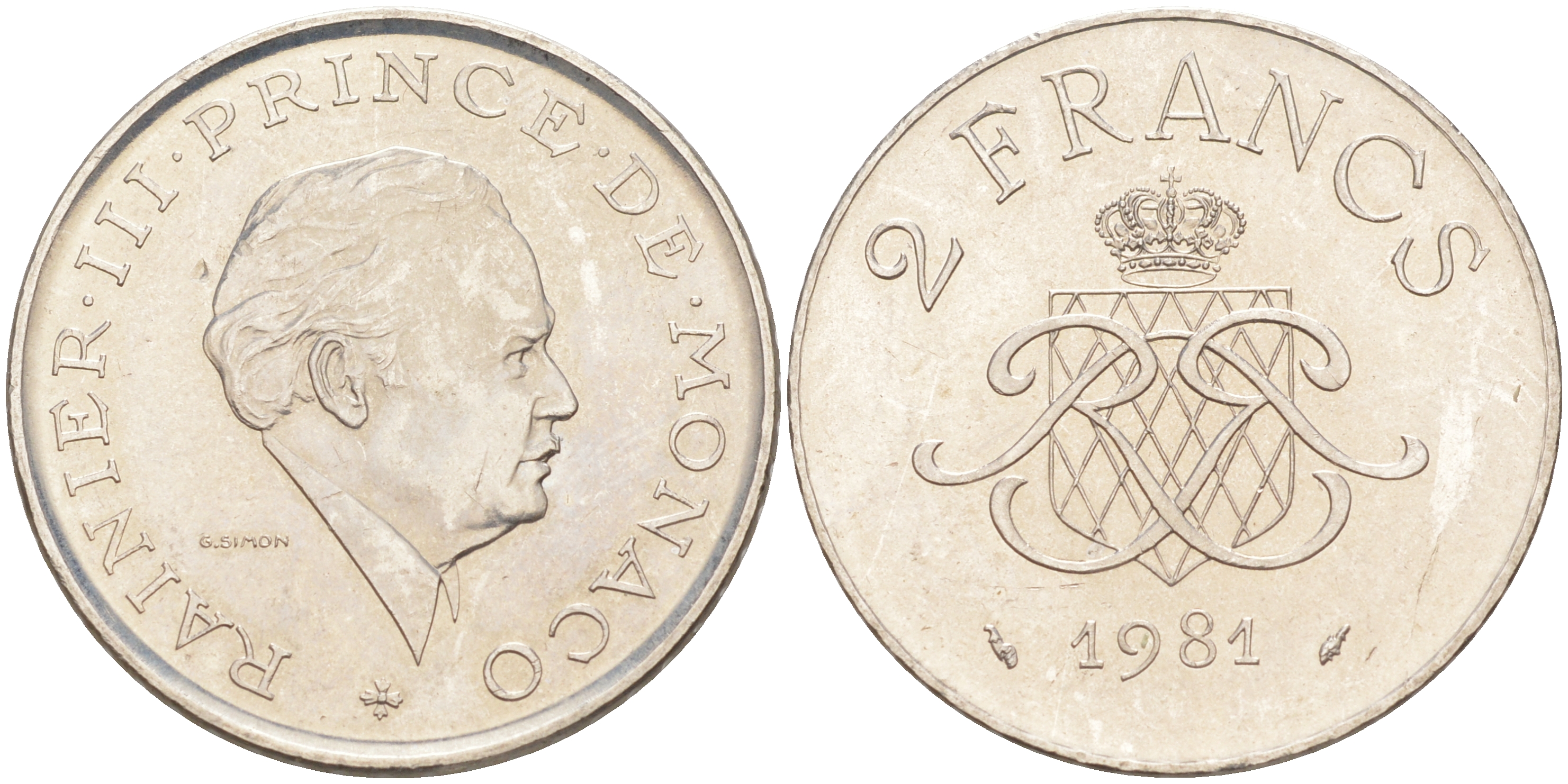 МОНАКО 2 ФРАНКА 1981 РЕНЬЕ III (1949-2005) KM 157 никель 190-551