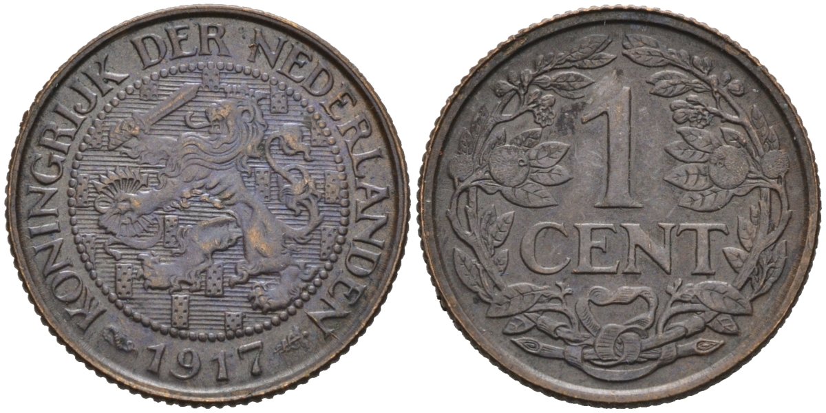 Нидерланды 1 цент 1917 Вильгельмина (1890-1948) KM 152 бронза 4576-722