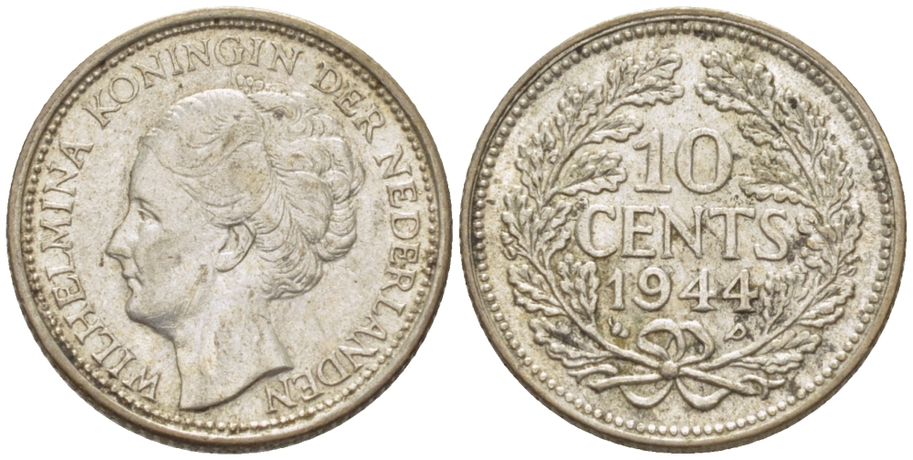НИДЕРЛАНДЫ 10 ЦЕНТОВ 1944 ВИЛЬГЕЛЬМИНА KM 163 серебро aUNC 4392-1016