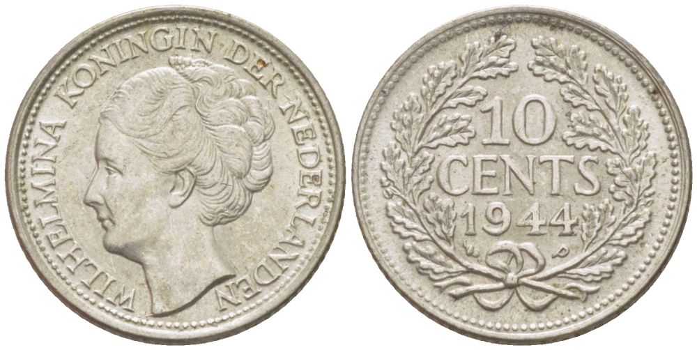 НИДЕРЛАНДЫ 10 ЦЕНТОВ 1944 ВИЛЬГЕЛЬМИНА KM 163 серебро aUNC 66-1237