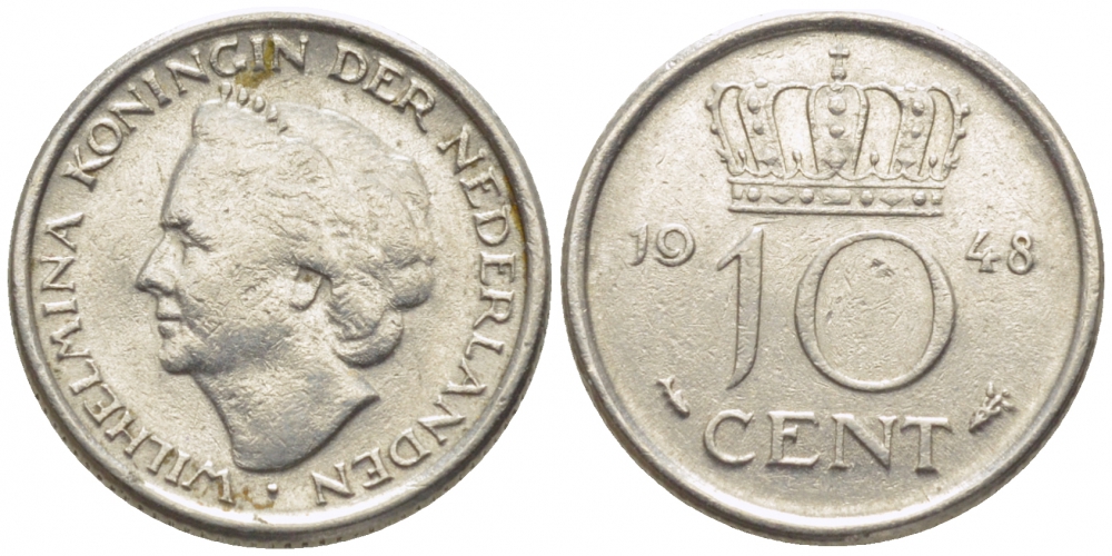 Нидерланды 10 центов 1948 Вильгельмина (1895-1948) KM 177 никель 112-258