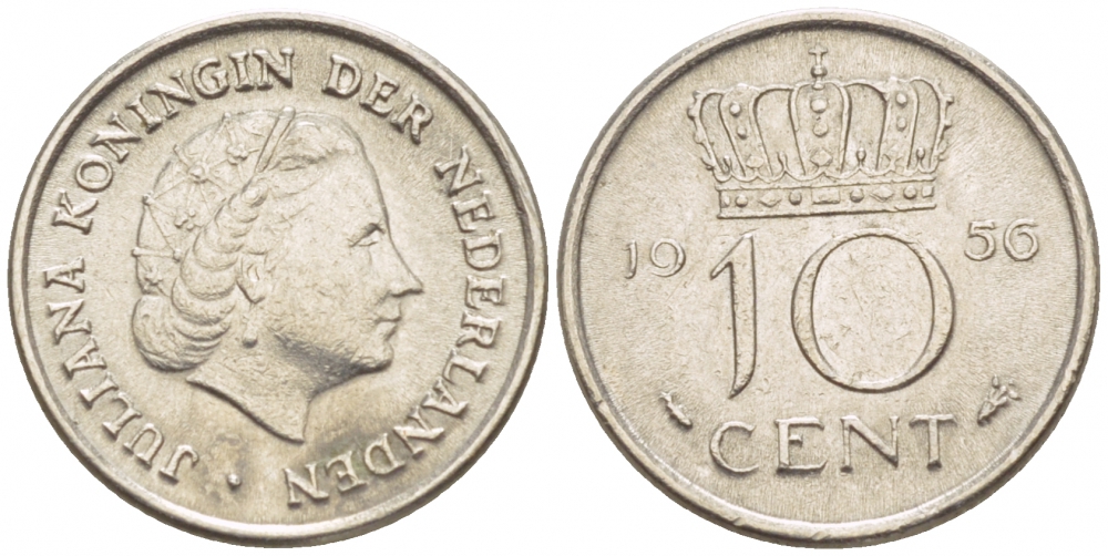 НИДЕРЛАНДЫ 10 ЦЕНТОВ 1956 ЮЛИАНА KM 182 никель 4547-827