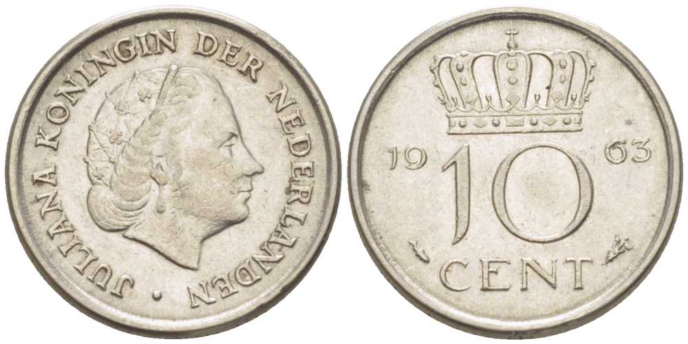НИДЕРЛАНДЫ 10 ЦЕНТОВ 1963 ЮЛИАНА (1948-1980) KM 182 никель 214-1162