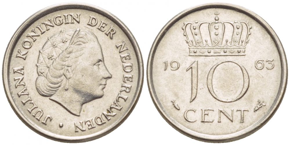 НИДЕРЛАНДЫ 10 ЦЕНТОВ 1963 ЮЛИАНА KM 182 никель 4547-835