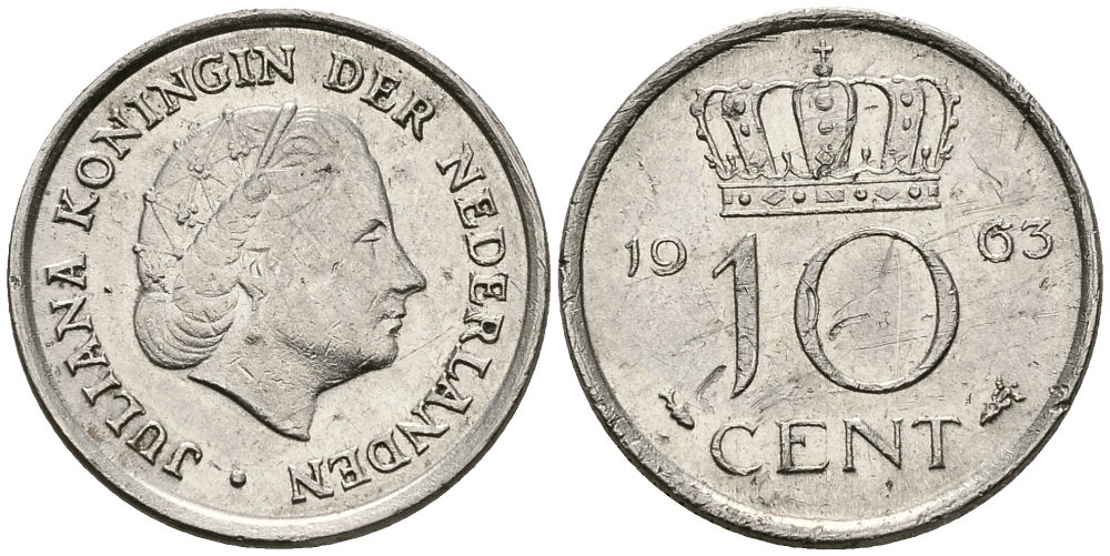 НИДЕРЛАНДЫ 10 ЦЕНТОВ 1965 ЮЛИАНА KM 182 никель 96-441