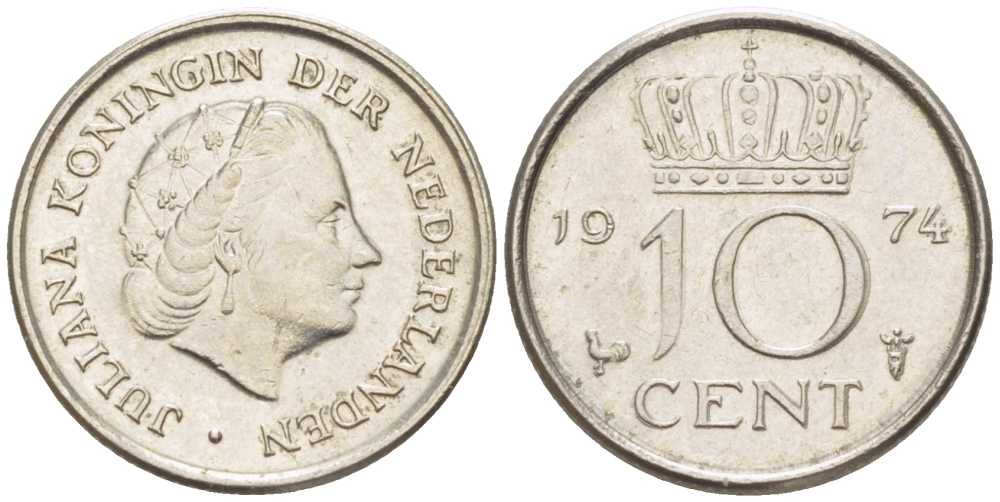 НИДЕРЛАНДЫ 10 ЦЕНТОВ 1974 ЮЛИАНА (1948-1980) KM 182 никель 116-468