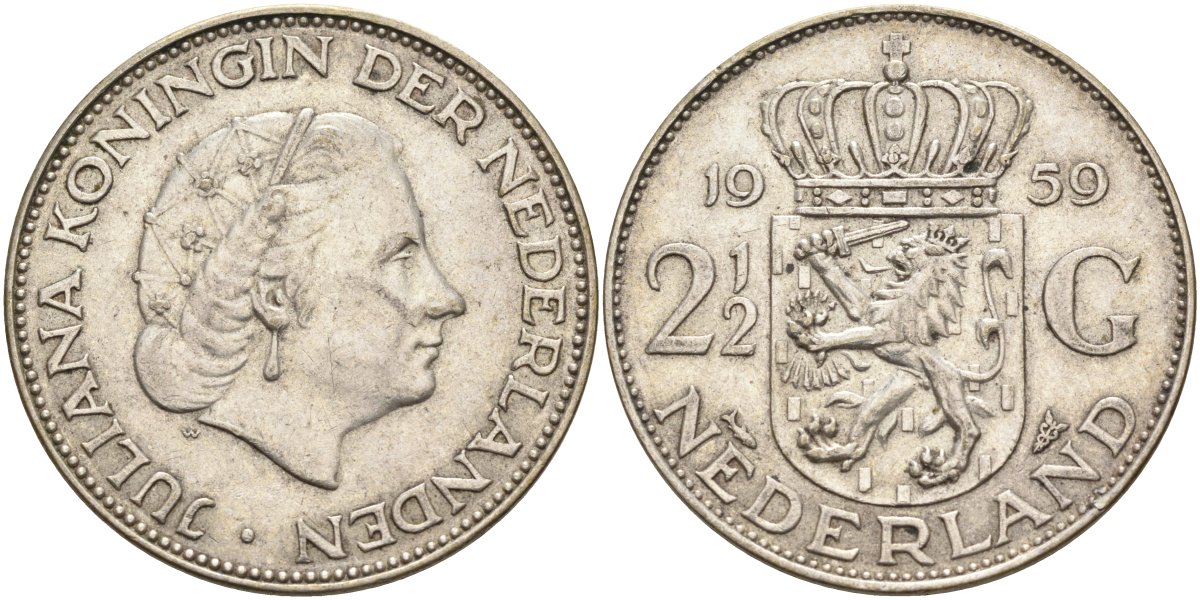 Нидерланды 2 1/2 гульдена 1959 Юлиана (1948-1980) KM 185 серебро 4131-1122