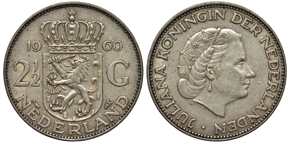 Нидерланды 2 1/2 гульдена 1960 Юлиана (1948-1980) KM 185 серебро 443-1121