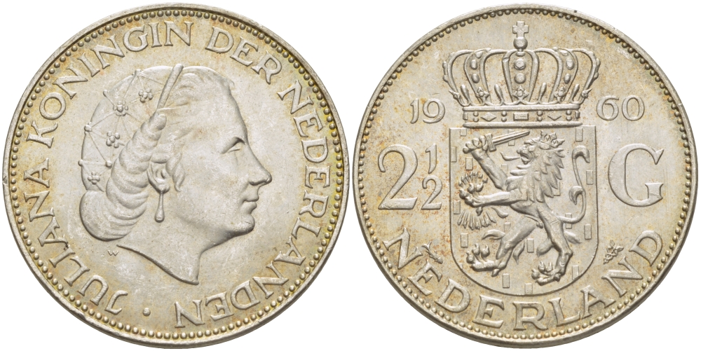 Нидерланды 2 1/2 гульдена 1960 Юлиана (1948-1980) KM 185 серебро 82-1215