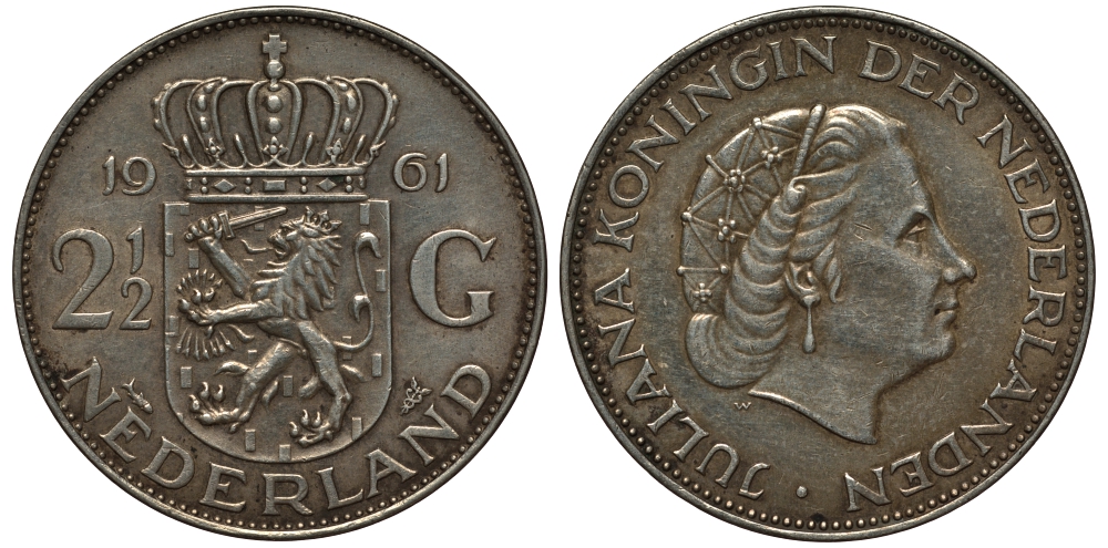 Нидерланды 2 1/2 гульдена 1961 Юлиана (1848-1980) KM 185 серебро 413-3535