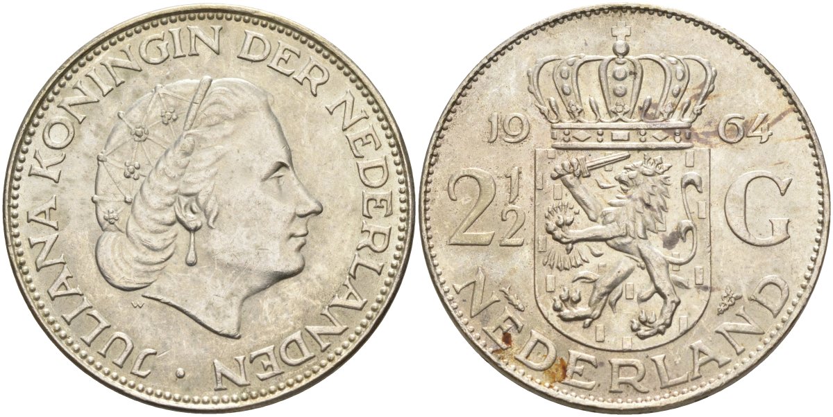 Нидерланды 2 1/2 гульдена 1964 Юлиана (1948-1980) KM 185 серебро 4131-1046