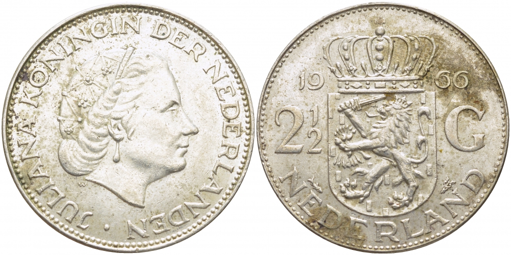 Нидерланды 2 1/2 гульдена 1966 Юлиана (1948-1980) KM 185 серебро 114-911
