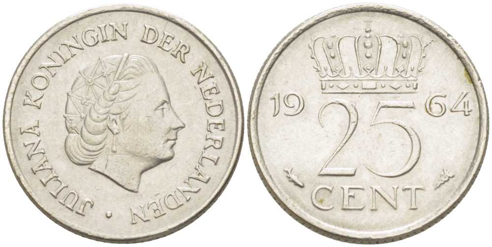 НИДЕРЛАНДЫ 25 ЦЕНТОВ 1964 ЮЛИАНА (1948-1980) KM 183 никель 214-939