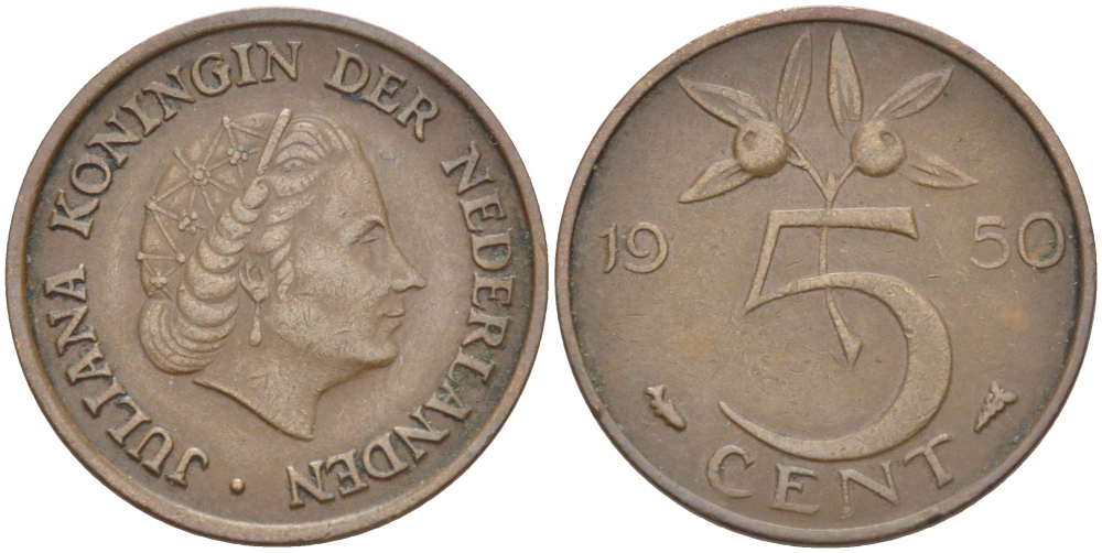 НИДЕРЛАНДЫ 5 ЦЕНТОВ 1950 ЮЛИАНА KM 181 бронза 214-764