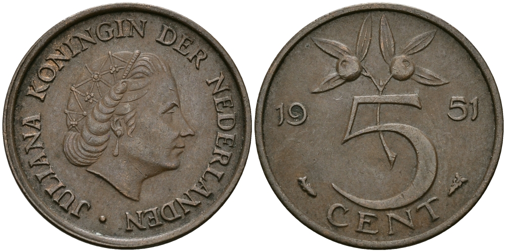 НИДЕРЛАНДЫ 5 ЦЕНТОВ 1951 ЮЛИАНА KM 181 бронза 95-246