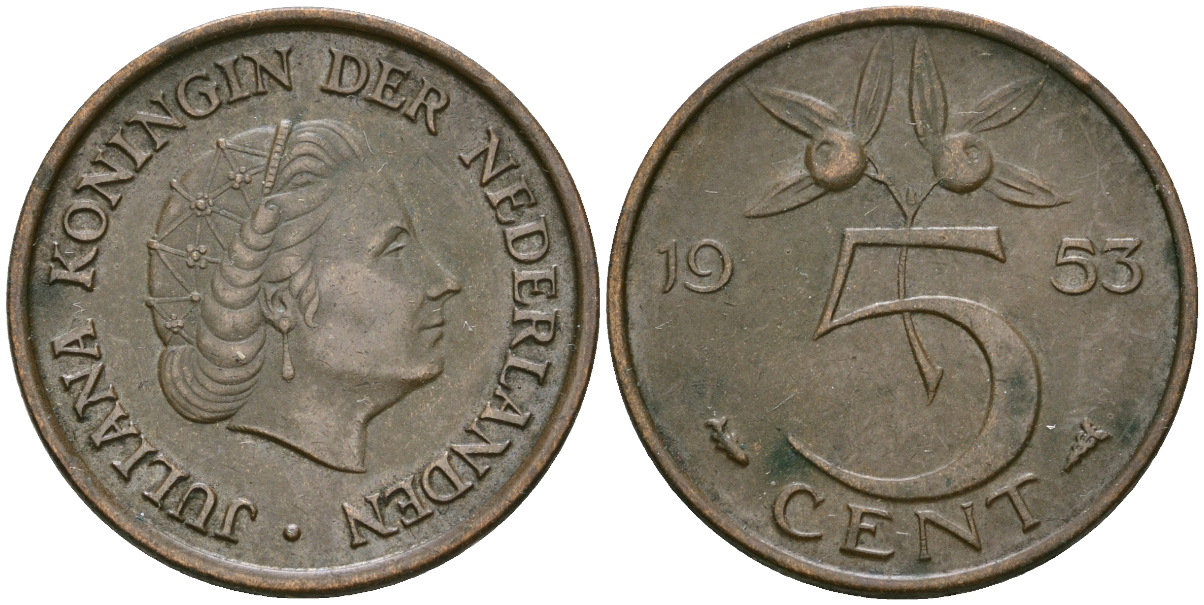 Нидерланлы 5 центов 1953 Юлиана (1949-1980) KM 181 бронза 4364-1626