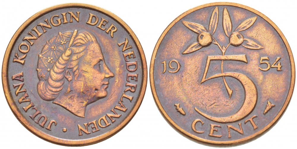 НИДЕРЛАНДЫ 5 ЦЕНТОВ 1954 ЮЛИАНА KM 181 бронза 3718-159