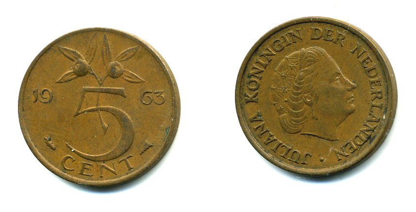 НИДЕРЛАНДЫ 5 ЦЕНТОВ 1963 ЮЛИАНА KM 181 бронза 76-427