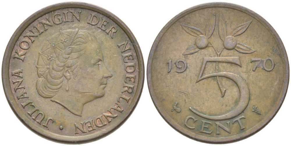 НИДЕРЛАНДЫ 5 ЦЕНТОВ 1970 ЮЛИАНА (1948-1980) KM 181 бронза 213-1055
