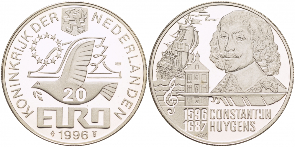 НИДЕРЛАНДЫ 20 ЕВРО 1996 (1596-1687) КОНСТАНТИН ГЮЙГЕНС серебро PROOF 1068-1-54
