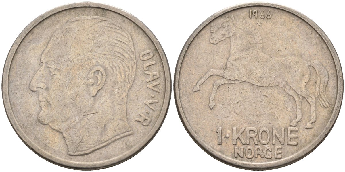 Норвегия 1 крона 1966 лошадь, Улаф V (1958-1991) KM 409 медно-никель 4571-211