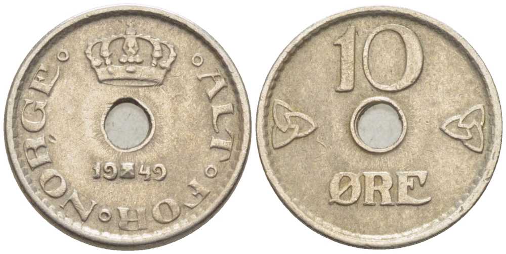 НОРВЕГИЯ 10 ЭРЕ 1949 ХОКОН VII (1905-1957) KM 383 медно-никель 116-1114