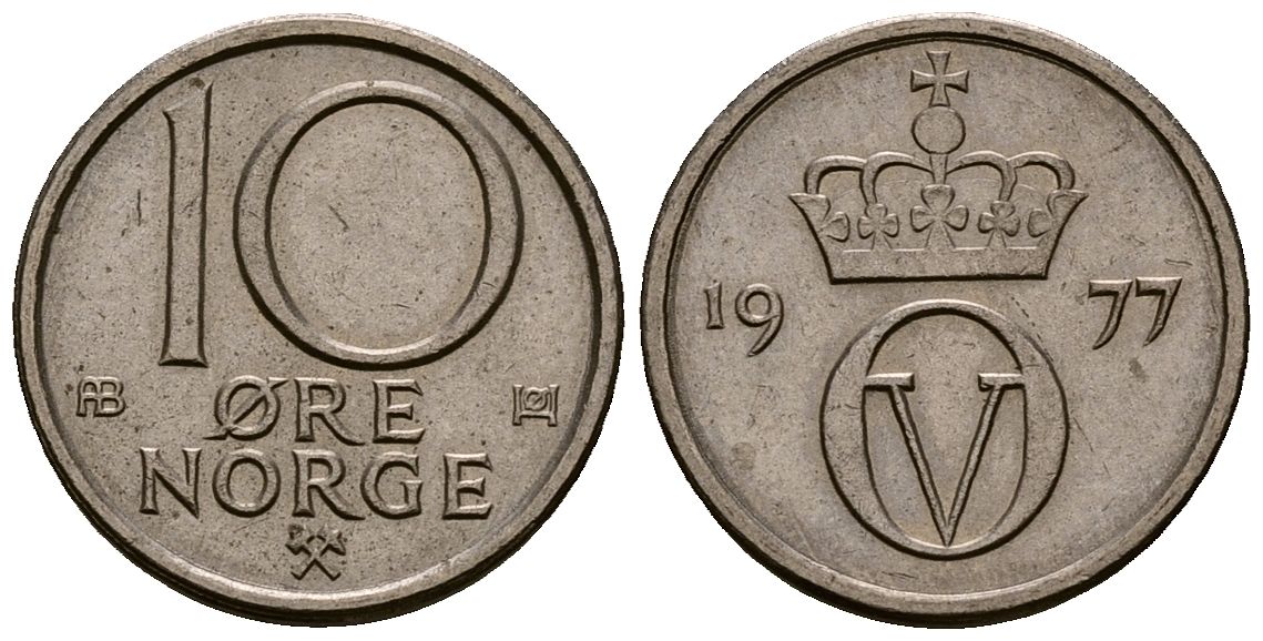 Норвегия 10 эре 1977 Улаф V (1957-1991) KM 416 медно-никель 4173-741