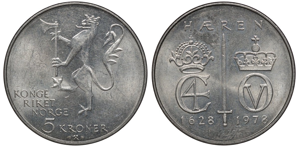 Норвегия 5 крон 1978 350 лет Норвежской армии KM 423 медно-никель UNC 81-743