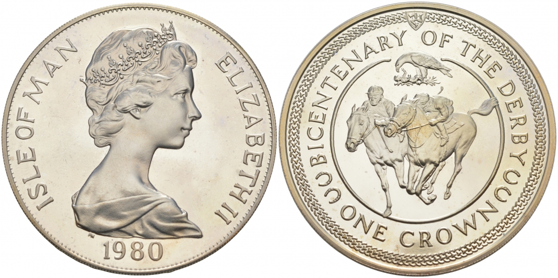 Остров Мэн 1 крона 1980 200 лет дерби, ипподромные скачки KM 63a серебро PROOF 11-037-12
