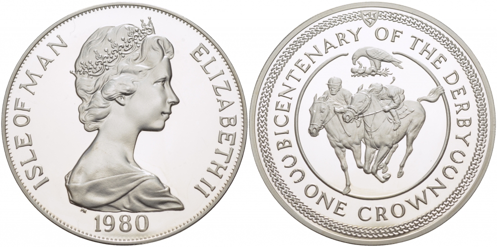 Остров Мэн 1 крона 1980 200 лет дерби, ипподромные скачки KM 63а серебро PROOF 1082-2-24