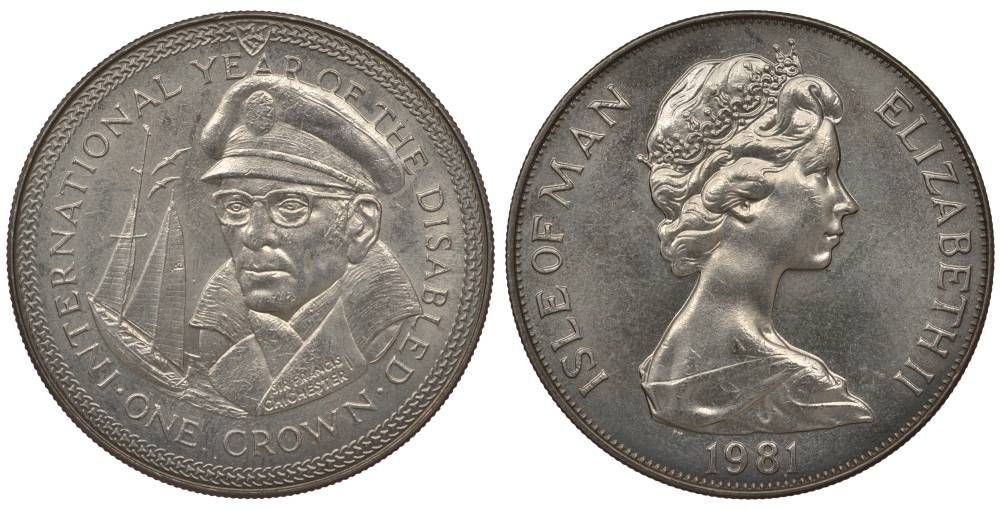 Остров Мэн 1 крона 1981 Международный год инвалидов, Сэр Фрэнсис Чичестер, яхта KM 80 медно-никель UNC 01-163-25