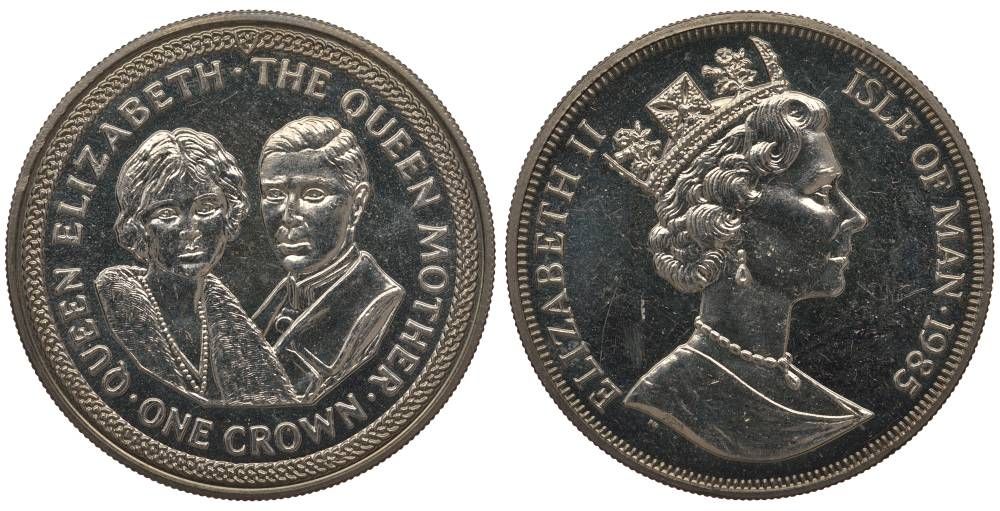 ОСТРОВ МЭН 1 КРОНА 1985 КОРОЛЕВА ЕЛИЗАВЕТА - КОРОЛЕВА МАТЬ, КОРОЛЕВА МАТЬ И ГЕОРГ V KM 217 медно-никель UNC 1078-1-34