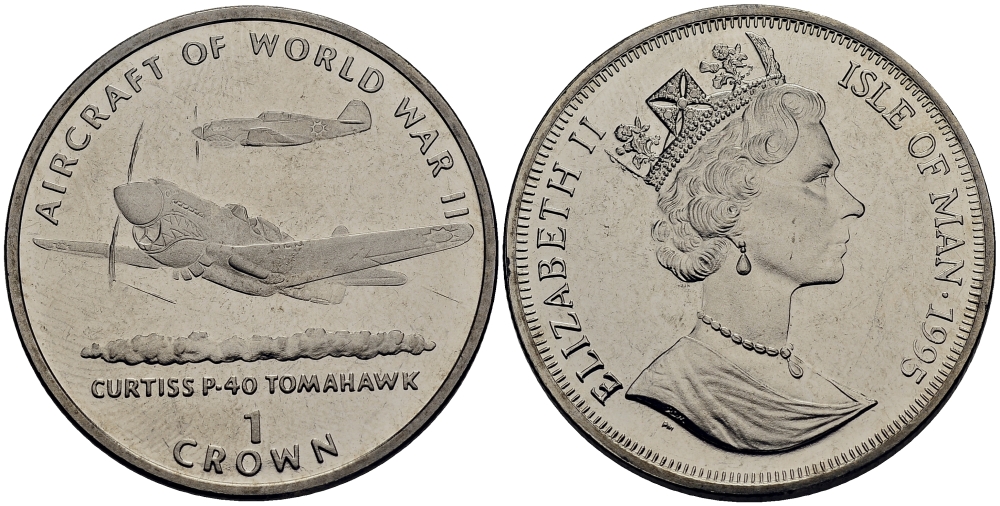 Остров Мэн 1 крона 1995 самолеты II-ой мировой войны, Куртис P-40 Томагавк КМ 520 медно-никель UNC M91-10