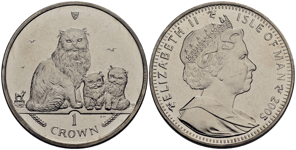 Остров Мэн 1 крона 2005 гималайская кошка с котятами КМ 1266 медно-никель UNC 118-235