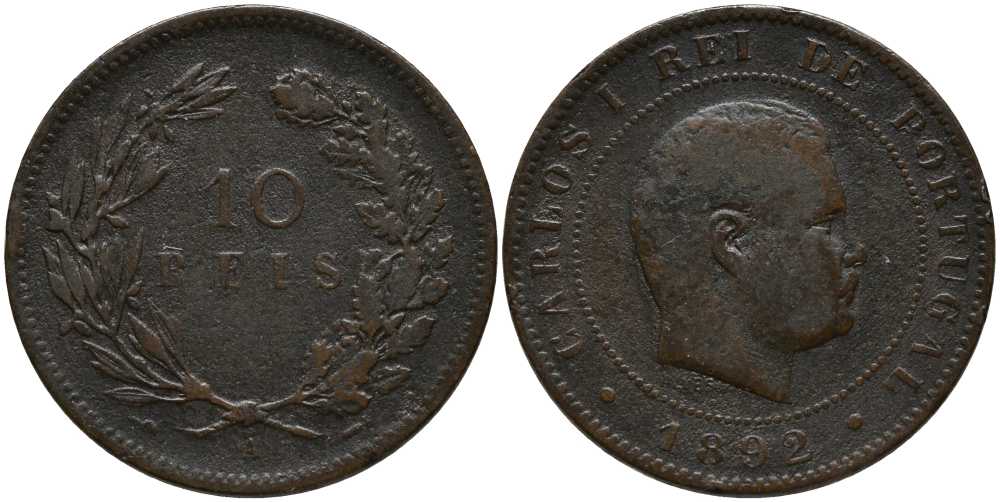 ПОРТУГАЛИЯ 10 РЕЙС 1892 А, КАРЛОС I (1889-1908) KM 532 бронза 202-257