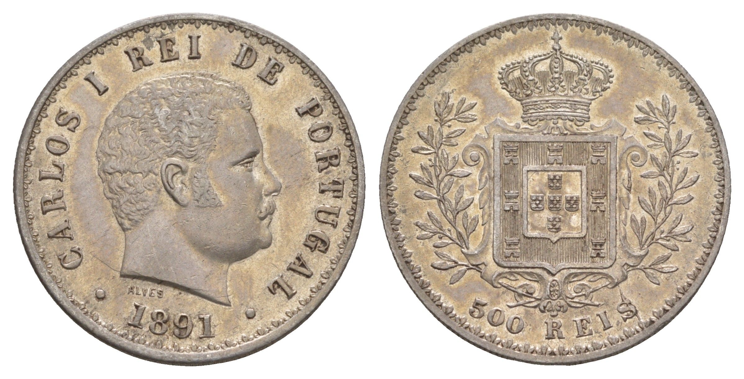 Португалия 500 реалов (рейсов) 1891 Карлуш I (1889-1908) KM 535 серебро 3896-121