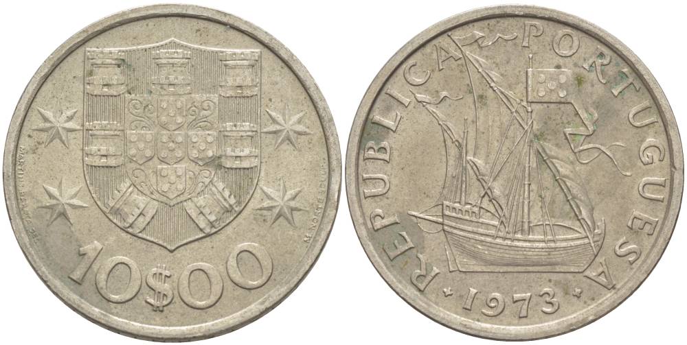 Португалия 10 эскудо 1973 парусник KM 600 никель плакированный медно-никелем 00-00