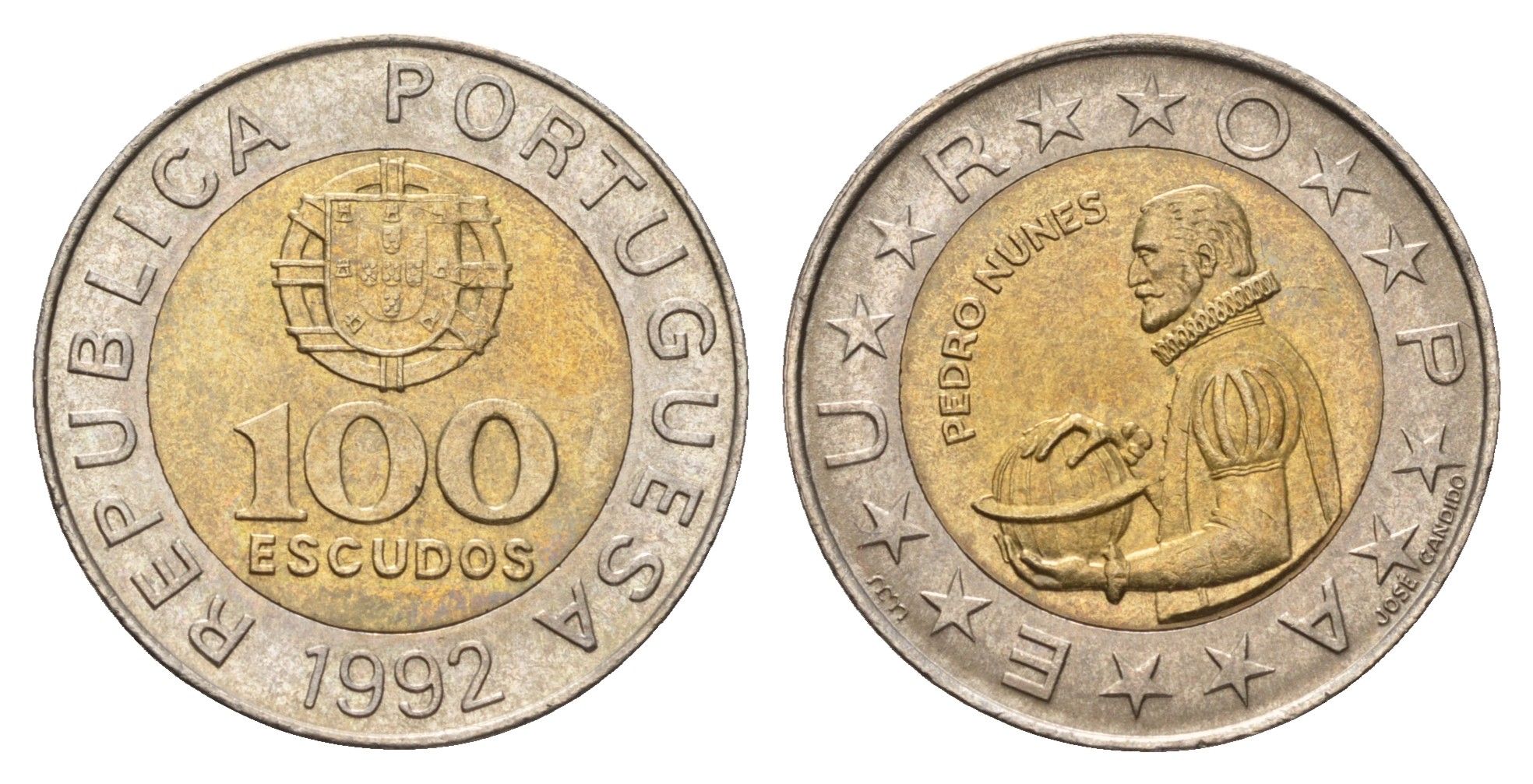 Португалия 100 эскудо 1992 Педру Нуниш (1502-1578), математик KM 645 биметалл aUNC 4678-823