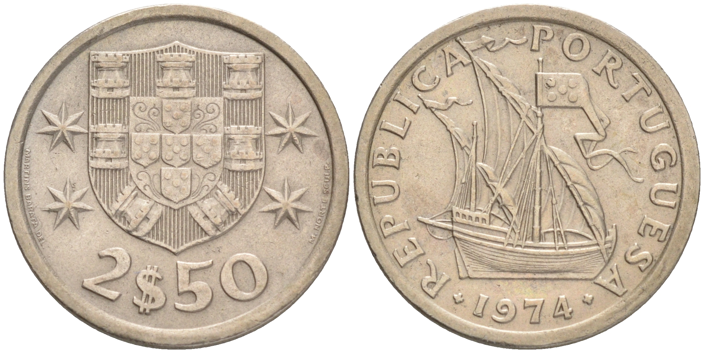 ПОРТУГАЛИЯ 2,5 ЭСКУДО 1974 ПАРУСНИК KM 590 медно-никель 75-1618