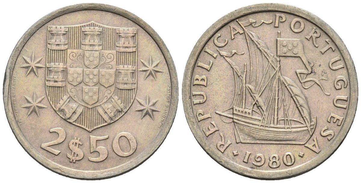 Португалия 2,5 эскудо 1980 парусник KM 590 медно-никель 4147-638