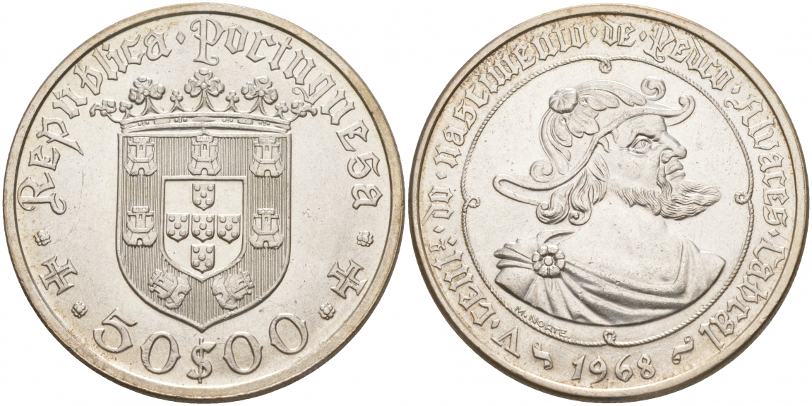 ПОРТУГАЛИЯ 50 ЭСКУДО 1968 500 ЛЕТ ПЕДРО АЛЬВАРЕСУ, НАВИГАТОРУ, ПЕРВООТКРЫВАТЕЛЮ БРАЗИЛИИ KM 593 серебро UNC 4537-1031