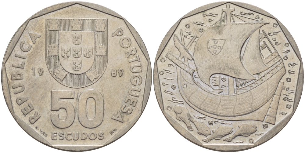 ПОРТУГАЛИЯ 50 ЭСКУДО 1989 КОРАБЛЬ KM 636 медно-никель 32-1224