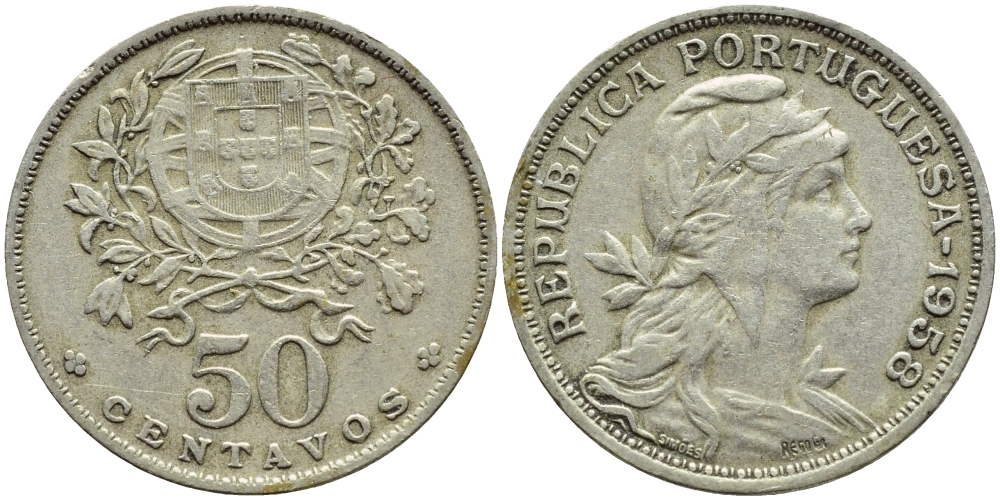 Португалия 50 сентаво 1958 KM 577 медно-никель 4395-817