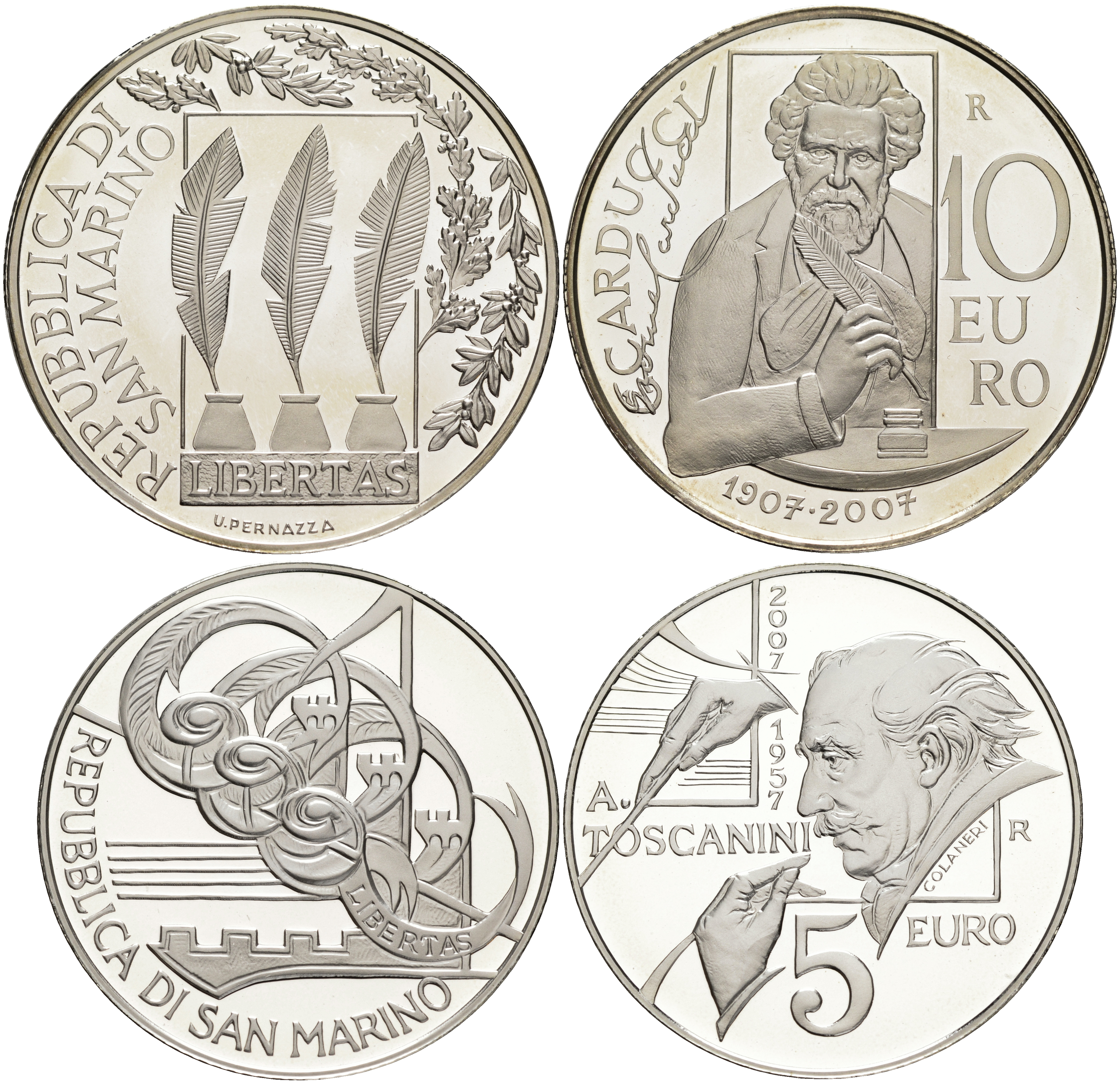 Сан-Марино набор 5 евро + 10 евро 2007 поэт Джозуэ Кардуччи и дирижер Артуро Тосканини, в оригинальной коробке, с сертификатом KM 474, 475 серебро PROOF 1-4-4-02