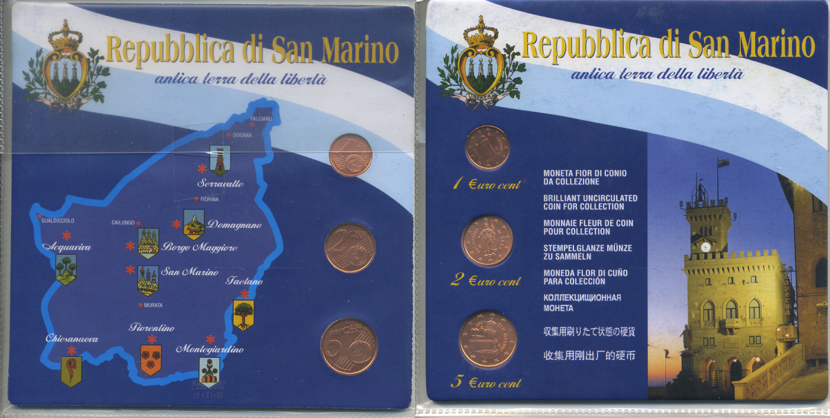 Сан-Марино набор из 3 монет 2006 1, 2, 5 евроцентов в картонном буклете UNC 1-4-2-26